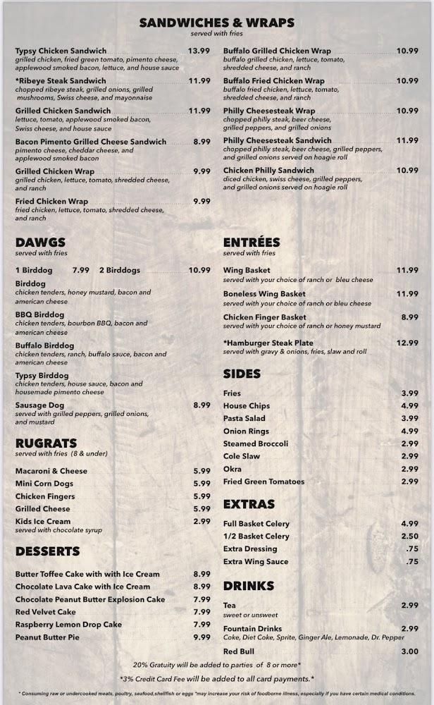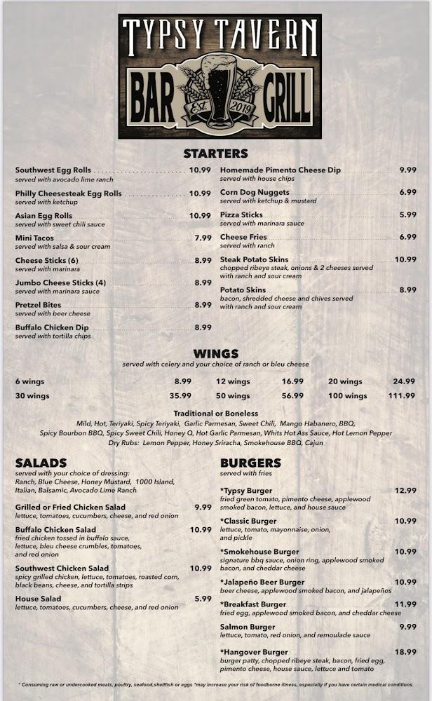 The menu at Typsy Tavern boasts a wide range of options catering to various tastes. Start with tempting appetizers like homemade pimento cheese dip or the philly cheesesteak egg rolls, both perfect for sharing. Wings are a standout item, available in various sizes and flavors to satisfy any craving.